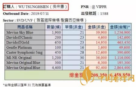 除此之外,黃國(guó)昌還貼出一張“訂購(gòu)單”圖片,其中顯示“訂購(gòu)”內(nèi)容為八種香煙,金額總計(jì)6458850元新臺(tái)幣,還標(biāo)注了航班、日期、機(jī)場(chǎng)等信息,而“訂購(gòu)人”一欄還清楚寫(xiě)著“吳宗憲”的大名。