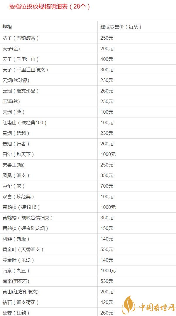 D類:嬌子寬窄逍遙、嬌子寬窄逍遙細(xì)支、嬌子紅韻新、鉆石荷花、云煙軟大重九、白沙細(xì)支和天下、天子壹號(hào)。參考價(jià)段為:?jiǎn)螚l批發(fā)價(jià)380元及以上共4個(gè)價(jià)段。