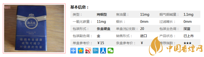 15塊一包的價格,個人覺得有點高。雖然價錢和金銳一樣,但是感覺味道比金銳大些,醇的感覺好像沒有金銳足。為了方便了解555·金香煙價格圖片相關(guān)信息,下面就來看一看這款香煙在不同地區(qū)的價格。