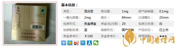 類型 :混合型 焦油量 :1mg 煙氣煙堿量 :0.1mg 一氧化碳量 :2mg