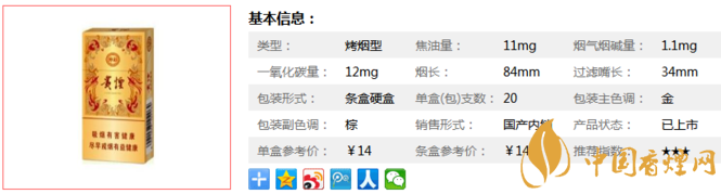 類型 :烤煙型 焦油量 :11mg 煙氣煙堿量 :1.1mg 一氧化碳量 :12mg