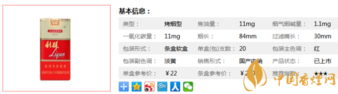 類型 :烤煙型 焦油量 :11mg 煙氣煙堿量 :1.1mg 一氧化碳量 :11mg