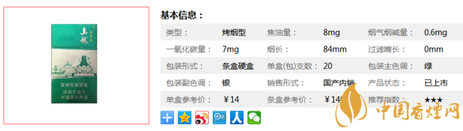 類型 :烤煙型 焦油量 :8mg 煙氣煙堿量 :0.6mg 一氧化碳量 :7mg