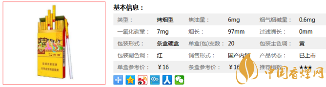 類型 :烤煙型 焦油量 :6mg 煙氣煙堿量 :0.6mg 一氧化碳量 :7mg