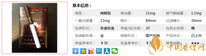 | 類型 :烤煙型 | 焦油量 :11mg | 煙氣煙堿量 :1.1mg | 一氧化碳量 :11mg |
