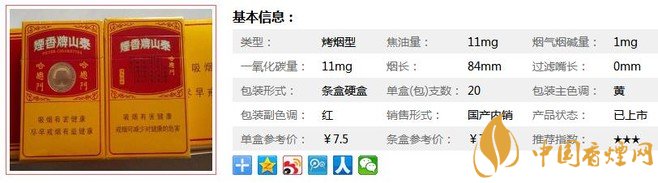 | 類(lèi)型 :烤煙型 | 焦油量 :11mg | 煙氣煙堿量 :1mg | 一氧化碳量 :11mg |