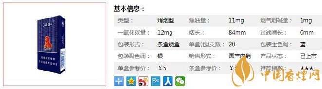 類型 :烤煙型 焦油量 :11mg 煙氣煙堿量 :1mg 一氧化碳量 :12mg