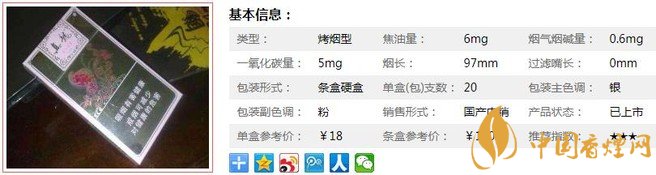 類型 :烤煙型 焦油量 :6mg 煙氣煙堿量 :0.6mg 一氧化碳量 :5mg