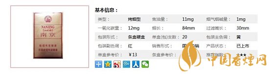 類型 :烤煙型 焦油量 :11mg 煙氣煙堿量 :1mg 一氧化碳量 :12mg