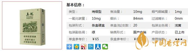 | 類型 :烤煙型 | 焦油量 :10mg | 煙氣煙堿量 :1mg | 一氧化碳量 :10mg |