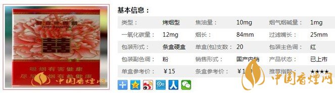 雙喜和喜煙支長(zhǎng)84mm,過(guò)濾嘴長(zhǎng)25mm,針對(duì)消費(fèi)者口味特點(diǎn)構(gòu)建了新的研發(fā)平臺(tái),綜合運(yùn)用了調(diào)香最新技術(shù),進(jìn)一步強(qiáng)化卷煙“甜、柔、順”的上乘品質(zhì)特點(diǎn)。下面我們一起來(lái)看雙喜和喜的參數(shù)信息:焦油量:10mg. 煙堿量:1mg. 一氧化碳量:12mg.