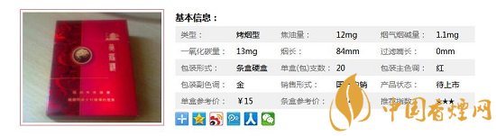 類型 :烤煙型 焦油量 :12mg 煙氣煙堿量 :1.1mg 一氧化碳量 :13mg