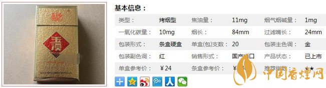 | 類型 :烤煙型 | 焦油量 :11mg | 煙氣煙堿量 :1mg | 一氧化碳量 :10mg |