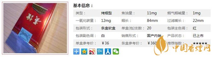 類型 :烤煙型 焦油量 :11mg 煙氣煙堿量 :1mg 一氧化碳量 :12mg