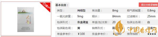 類型 :烤煙型 焦油量 :8mg 煙氣煙堿量 :0.8mg 一氧化碳量 :9mg