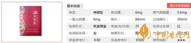 | 類型 :烤煙型 | 焦油量 :6mg | 煙氣煙堿量 :0.6mg | 一氧化碳量 :6mg |