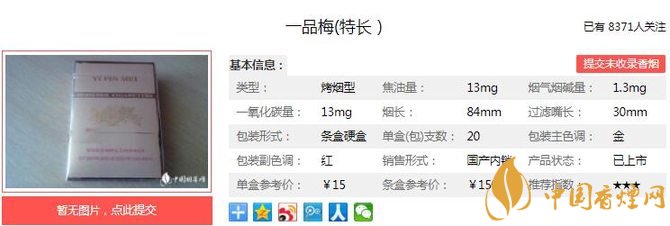 商標(biāo)主色調(diào)為金色,富麗堂皇,氣派尊貴; 香氣濃馥、悠長,煙氣豐滿細(xì)膩,層次感強(qiáng),余味干凈舒適,口感純正,入喉舒適和順; 30mm超長濾嘴,有效降低煙氣中焦油、一氧化碳等有害物質(zhì)。經(jīng)香煙網(wǎng)小編市場調(diào)查一品梅特長售價(jià)為15元/包。