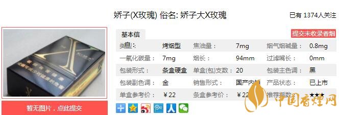 嬌子(X)系列是川渝中煙生產(chǎn)的細(xì)支煙系列,其中的THE X、X玫瑰和X金桂,煙支的粗細(xì)相同,有的比常見的細(xì)支煙稍微粗一點(diǎn),有的又比常規(guī)的煙支細(xì)一點(diǎn),但川渝中煙將其定位與細(xì)支煙系列。下面就由香煙網(wǎng)小編帶大家一起來了解嬌子X玫瑰的相關(guān)信息。