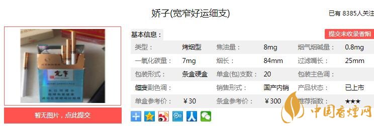 嬌子寬窄好運(yùn)細(xì)支煙支長84mm,過濾嘴長32mm,“寬窄”專線生產(chǎn),管理精細(xì)、標(biāo)準(zhǔn)精確、加工精準(zhǔn)、制造精心。煙葉色澤均勻,填充比較緊實(shí),煙紙為圓紋造型。下面我們一起來看嬌子寬窄好運(yùn)細(xì)支的參數(shù)信息:焦油量:8mg 煙堿量:0.8mg 一氧化碳量:7mg