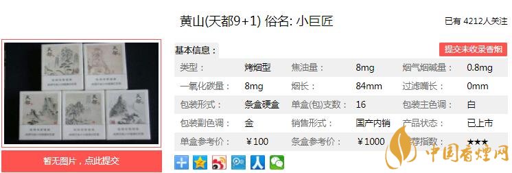 黃山(天都9+1),作為天都(巨匠)的普世之作,條盒內(nèi)含“天都”九包,“天都小巨匠”一包,蘊含“九九歸一”之寓意,九大匠心,凝聚其中。經(jīng)香煙網(wǎng)小編市場調(diào)查黃山(天都9+1)售價為100元/包。