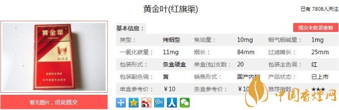 硬紅旗渠內(nèi)襯紙為銀色,煙支7-6-7排列。煙嘴很漂亮,有一道金箍圈在煙嘴和煙支之間,顯得豪華大氣,煙支上印著黑色紅旗渠楷體漢字以及紅色HONGQIQU漢語拼音。下面便是黃金葉(硬紅旗渠)的基本參數(shù):焦油量:10mg 煙堿量:1mg 一氧化碳量:11mg.