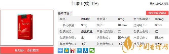 類型 :烤煙型 焦油量 :8mg 煙氣煙堿量 :0.8mg 一氧化碳量 :9mg