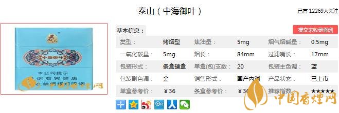 以上便是香煙網(wǎng)小編為大家介紹的關(guān)于泰山中海御葉香煙價(jià)格及圖片介紹 高性價(jià)比的細(xì)支低焦香煙的相關(guān)信息,看完之后大家是不是對(duì)于泰山(中海御葉)這款香煙的相關(guān)信息更加了解呢。大家還想查詢更多的相關(guān)內(nèi)容歡迎點(diǎn)擊:泰山香煙價(jià)格及圖片 泰山最貴的香煙排行榜
