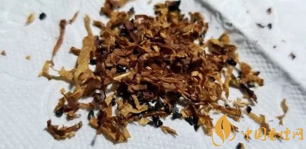 攤開煙絲,外觀金黃油潤。淺黃切寬略寬的為涂布制絲,其余為棕黃的原片煙絲,中間有切得極細小揉捻得很柔軟的煙梗。用料是比較實在的了。