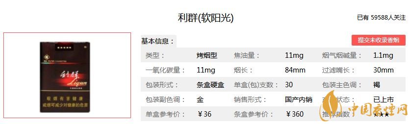 類型 :烤煙型 焦油量 :11mg 煙氣煙堿量 :1.1mg 一氧化碳量 :11mg