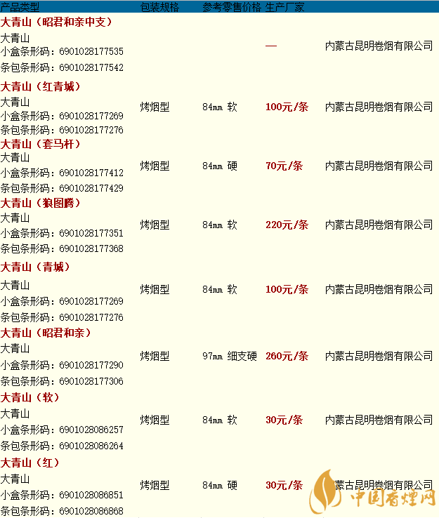 2025大青山香煙價格及圖片