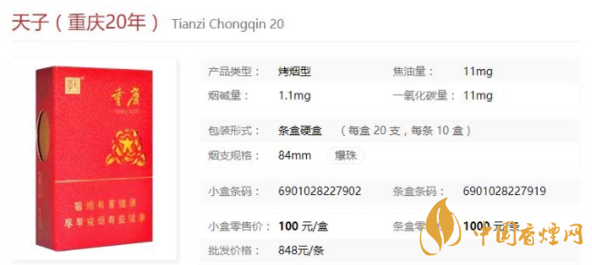 天子重慶20年是一款具有重慶地域特色的卷煙,按常規(guī),一支煙只有一種味道,但是天子重慶20年首創(chuàng)一煙四味,一吸本香,二吸茶香、三吸花香、四吸茶花香,四種口味自由切換。經(jīng)小編市場調(diào)查價(jià)格為100元/包。