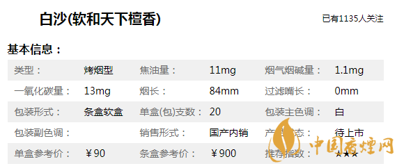 | 類(lèi)型 :烤煙型 | 焦油量 :11mg | 煙氣煙堿量 :1mg | 一氧化碳量 :13mg |