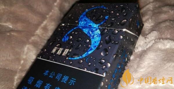 這款香煙正面外觀(guān)來(lái)看給人的第一印象它就是一款涼煙,炫酷純黑的底色搭配晶亮水滴為主色調(diào),同時(shí)冰藍(lán)顏色的抽象冰塊圖案形成了一個(gè)數(shù)字“8”形狀,讓人覺(jué)得涼爽的同時(shí)也突出了產(chǎn)品LOGO。
