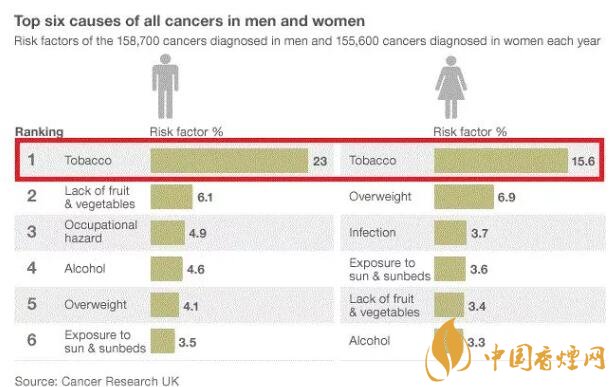 我國(guó)煙草生產(chǎn)量和消費(fèi)量穩(wěn)居世界第一,并擁有3億以上的煙民。雖然“吸煙有害健康”的標(biāo)語(yǔ)早已經(jīng)出現(xiàn)在大街小巷,但很多朋友只是莞爾一笑。其實(shí)這口號(hào)并非危言聳聽(tīng),煙草使用占所有死亡危險(xiǎn)因素的第2位。男性32.7%的癌癥死亡歸因于吸煙,遠(yuǎn)高于女性的5.0%。