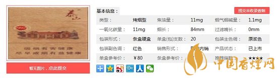 類型 :烤煙型 焦油量 :11mg 煙氣煙堿量 :1.1mg 一氧化碳量 :11mg