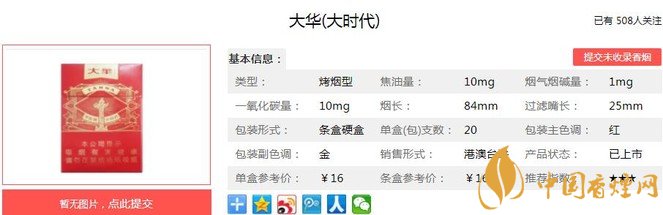 臺灣制造,取材自然,配方考究,工藝精湛,原料甄選自南緯23° 以北和北緯23°以南世界級優(yōu)質(zhì)名產(chǎn)區(qū)出產(chǎn)的優(yōu)質(zhì)烤煙煙葉,煙氣醇和飽滿,煙香細(xì)膩豐富,口感純正,三香合一。經(jīng)香煙網(wǎng)小編市場調(diào)查大華大時代售價為16元/包。