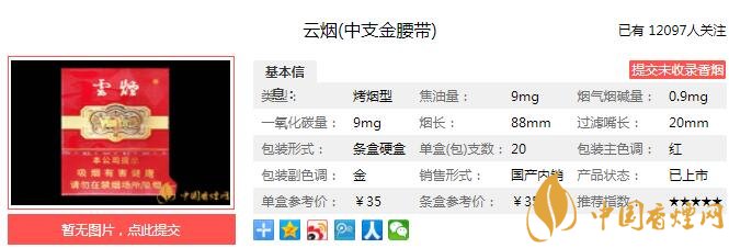云煙中支金腰帶價格 云煙中支金腰帶參數(shù)及口感分析