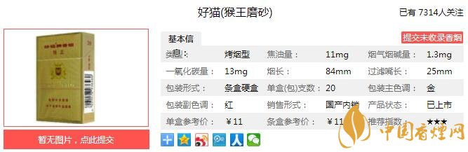 好貓牌香煙(猴王磨砂)”,簡稱“磨砂好貓”。產(chǎn)品的商標(biāo)保持原猴王包裝裝潢用料和設(shè)計(jì)特色,配方設(shè)計(jì)保持“猴王(磨砂)”卷煙產(chǎn)品吸食自然、醇和、明快的香氣特征和吸味風(fēng)格。經(jīng)香煙網(wǎng)小編市場調(diào)查好貓(猴王磨砂)售價(jià)為11元/包。
