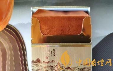 在煙盒處的腰間,一條金色的絲帶環(huán)繞整個(gè)煙盒。中央的水墨山水畫很是素雅,在畫中還有一段詩句,古香氣息彌漫。下半部的本公司提示不多贅述。