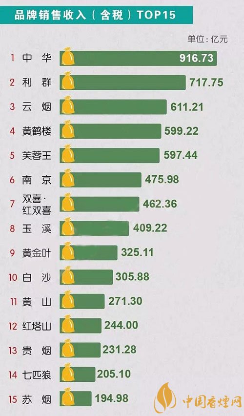 在品牌銷量收入排行榜top5中,中華香煙以900多億的收入當(dāng)之無(wú)愧位居榜首,與第二名利群拉開200億的差距,云煙、黃鶴樓、芙蓉王、南京、雙喜紅雙喜、玉溪、黃金葉、白沙、黃山、紅塔山、貴煙、七匹狼、蘇煙分別位居3-15位,第一名中華的收入也是15名蘇煙收入的5倍。