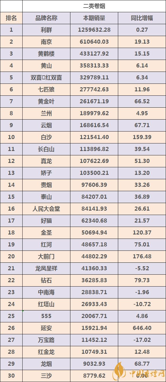 二、二類煙卷煙品牌TOP30強(qiáng)數(shù)據(jù)信息