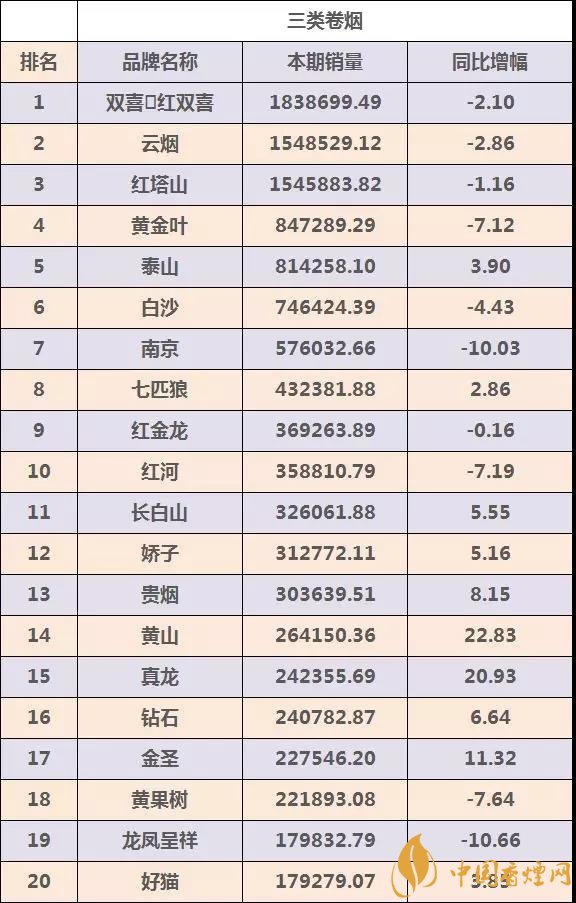 三、三類煙卷煙品牌TOP20強(qiáng)數(shù)據(jù)信息