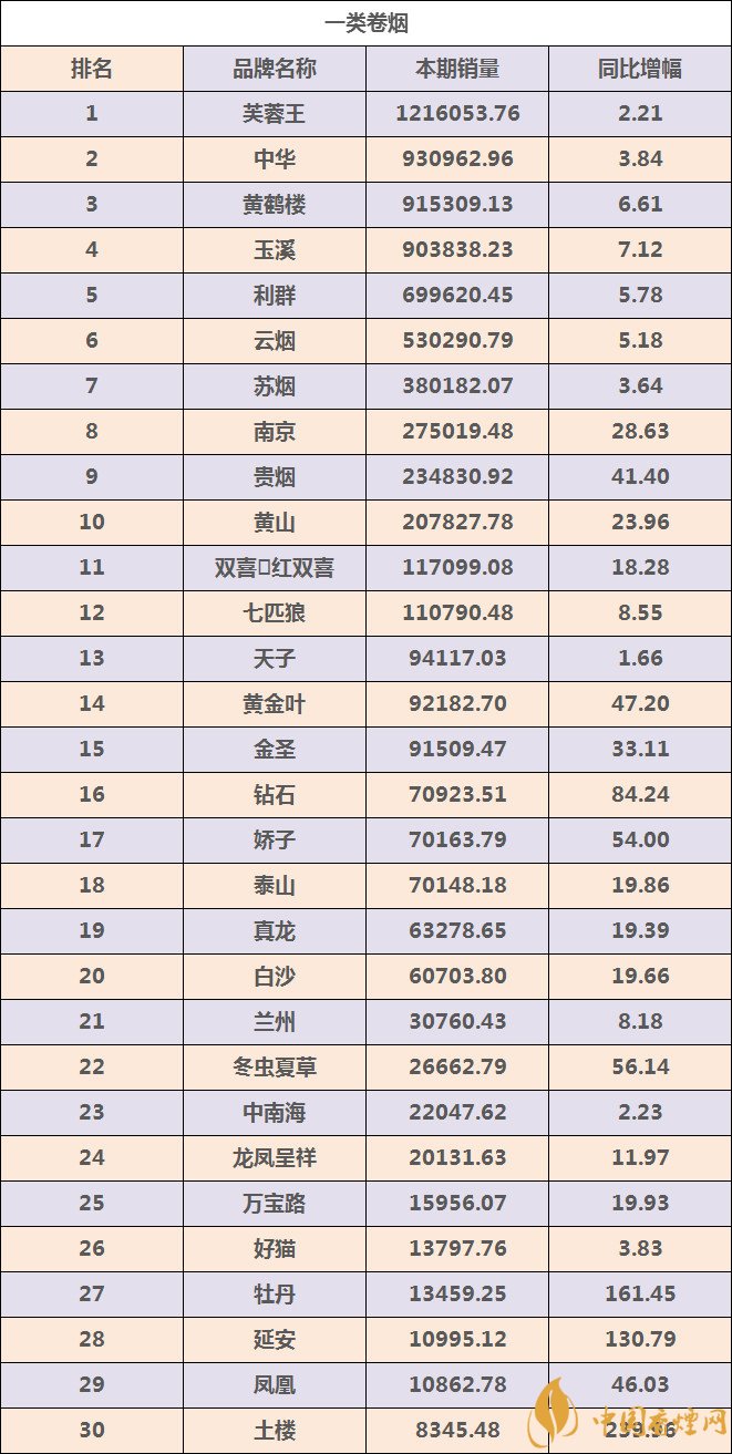 一、一類煙卷煙品牌TOP30強(qiáng)數(shù)據(jù)信息