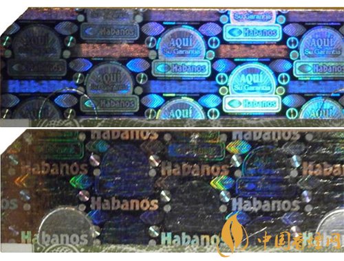 2013前的激光標(biāo),圓圈內(nèi)AQUI字樣清晰可見,方框內(nèi)Habanos字樣相對較小。而2013后的激光標(biāo),圓圈內(nèi)的AQUI字樣基本上已經(jīng)模糊不可見,而Habanos字樣則變得更大更清晰。