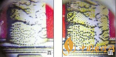 真煙天安門左側(cè)華表套色均勻,黃白色分布有明顯分界點(diǎn),邊緣光滑、干凈、清晰;假煙套色較差,黃白色不明顯,黃色部分印刷較分散,字體邊緣套印有毛渣點(diǎn),呈現(xiàn)鋸齒狀。