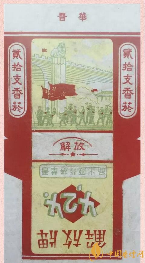 “424”解放牌卷煙 1949年4月24日,中國人民解放軍攻克了太原。太原戰(zhàn)役規(guī)模龐大,戰(zhàn)況慘烈,是中國人民解放軍經(jīng)典的戰(zhàn)役之一。山西晉華卷煙廠為紀(jì)念此日,出品“424”解放牌卷煙。煙標(biāo)上面是在太原首義門前,中國人民解放軍軍隊敲鑼吹號、勝利凱旋的畫面。