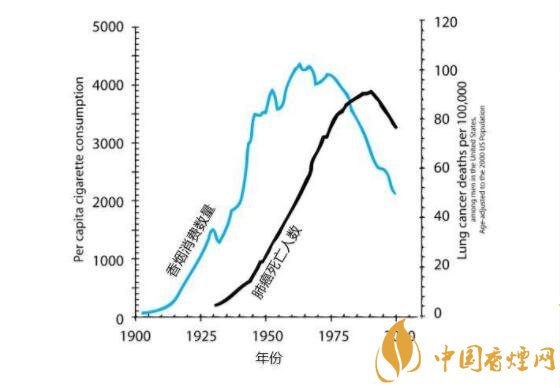 大家一看這個圖,就會發(fā)現(xiàn)吸煙數(shù)量和肺癌死亡數(shù)量的曲線幾乎一模一樣,但有大約25年的滯后:吸煙增加,肺癌會在25年后相應(yīng)增加,吸煙減少,肺癌也會在25年后相應(yīng)減少。這個奇特的滯后主要是因為肺癌發(fā)生是個非常慢的過程,從癌前變異,到早期癌癥,到晚期癌癥,一般需要10~20年時間。