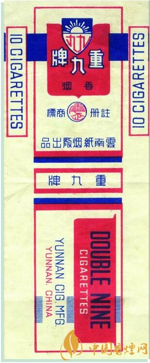1945年,云南紙煙廠出品。創(chuàng)牌于1922年,為紀(jì)念護(hù)國(guó)名將蔡鍔等所領(lǐng)導(dǎo)的“重九起義”而創(chuàng)牌,重九牌歷史悠久,具有豐富的文化內(nèi)涵,是云南紙煙廠的榮譽(yù)產(chǎn)品。該牌號(hào)卷煙僅生產(chǎn)13.85箱,屬罕見珍貴煙標(biāo),具有歷史文物價(jià)值。1945年6月1日云南紙煙廠在昆明金碧日?qǐng)?bào)刊登“重九”牌更換商標(biāo)紙盒啟示 , 以此啟示為證改寫了此枚珍貴歷史商標(biāo)的確切生產(chǎn)時(shí)間。