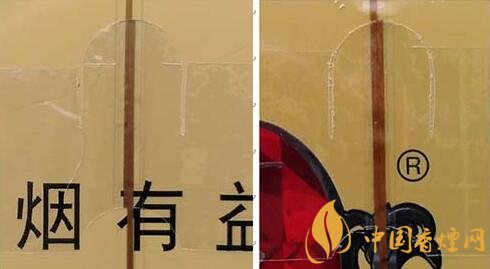 2.注冊(cè)商標(biāo)圖案。真品卷煙采用起凸工藝商標(biāo)印刷,圖案細(xì)節(jié)起凸完美,眼觀、手摸凹凸感明顯。該款假冒卷煙商標(biāo)印刷起凸工藝較差,部分細(xì)節(jié)未做起凸,手摸圖案平滑。(圖2左真右假)