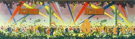 而貴陽(yáng)煙草公司出品于上世紀(jì)50年代的“祖國(guó)”煙標(biāo)(圖4),主版采用明快色調(diào),描繪出了新中國(guó)成立后人民當(dāng)家作主的喜悅之情:只見(jiàn)各族人民身著節(jié)日盛裝,在彩球飄飄、五顏六色的射燈光柱直射天空背景襯托下,聚集于天安門(mén)前的華表周?chē)?,在撼天?dòng)地的鼓樂(lè)聲中載歌載舞,盡情地歡慶新中國(guó)的誕生。